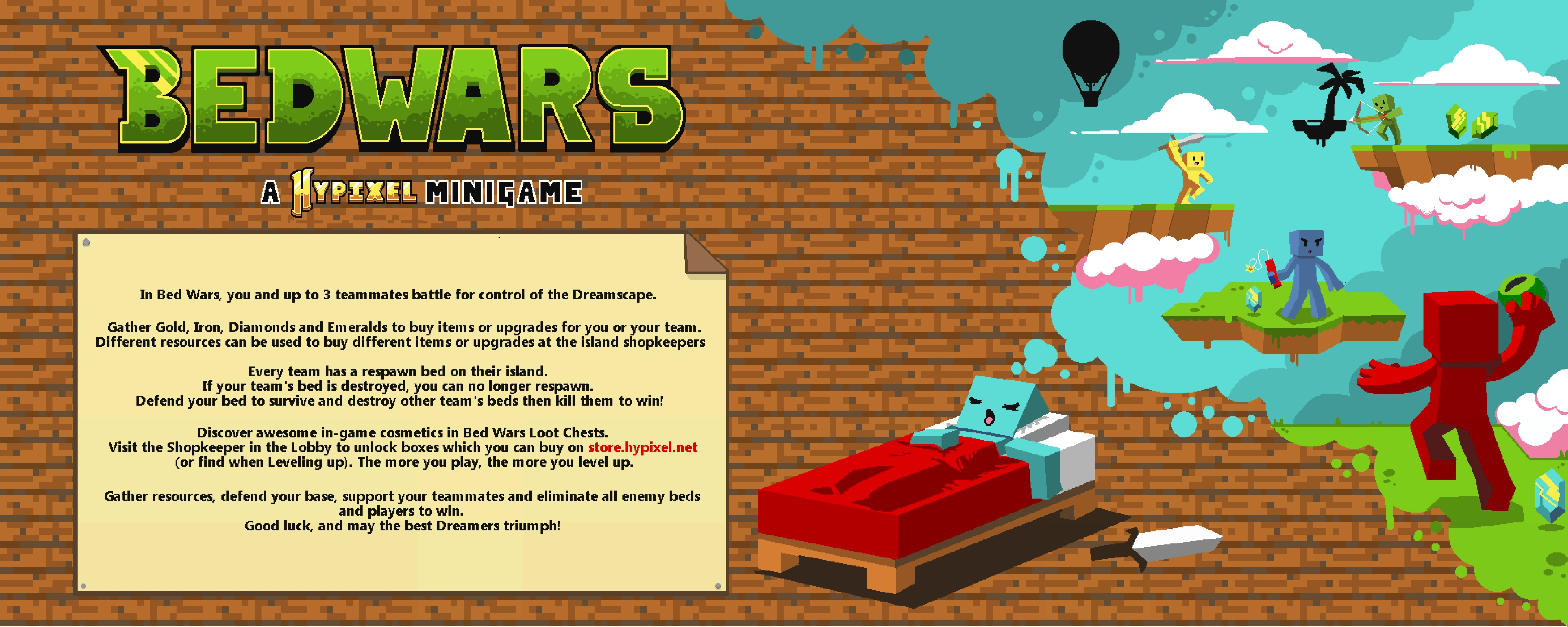 | “ | In Bed Wars, you and up to 4 teammates spawn on islands. You must gather 4 resources: Iron, Gold, Diamonds and Emeralds to buy items and upgrades at the Shopkeepers on your island.