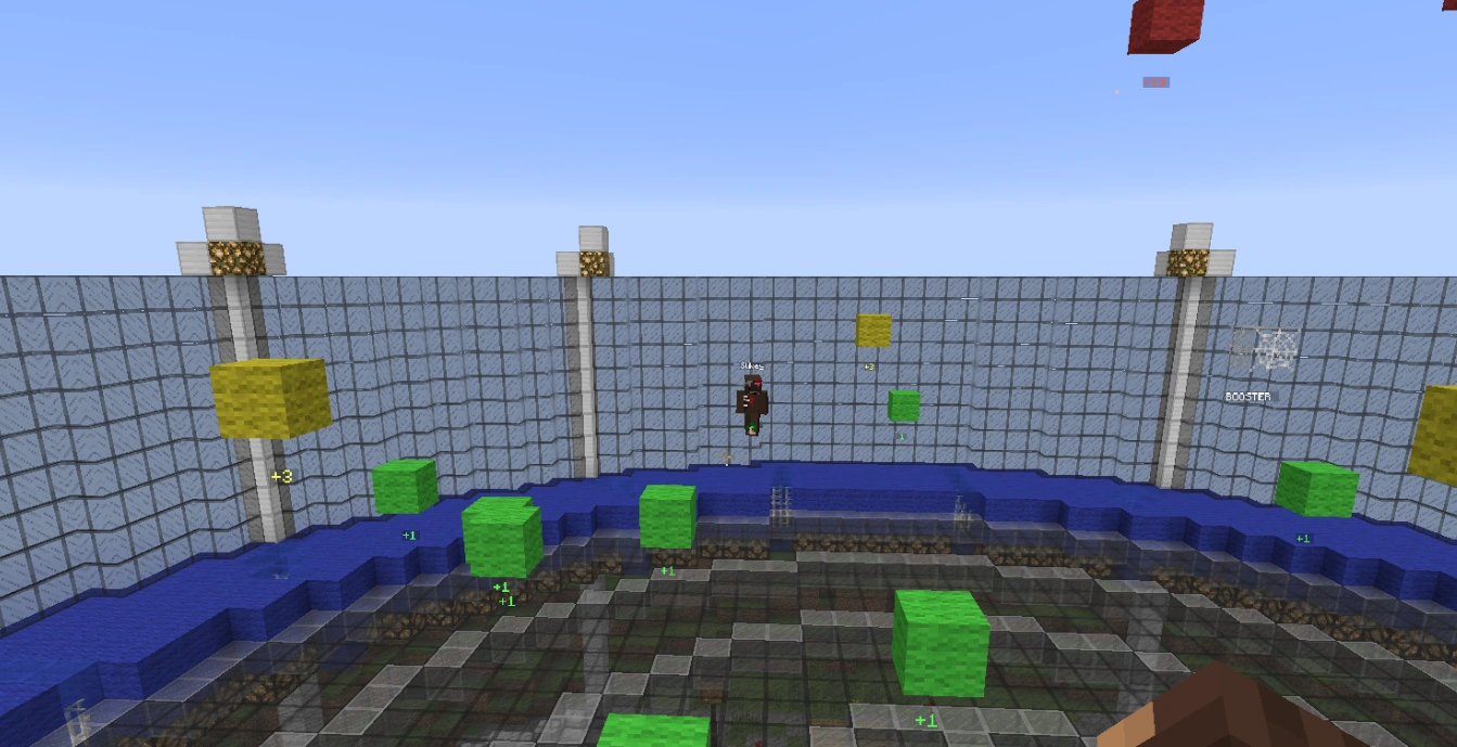 The map is a large "trampoline", in which you must bounce to try and hit colored wool to score points. The green wool is at the lower points, and gives 1 point per wool collected. Yellow is higher, awarding 3 points, and you must use the peak of your trampoline jump to reach it. Red wool is the highest wool in the game, and awards 10 points. To reach this you cannot use your regular bounce, but must collect a booster (shown as a cobweb in-game) which will shoot you upwards extremely high, allowing you to hit the red wool on your way down.