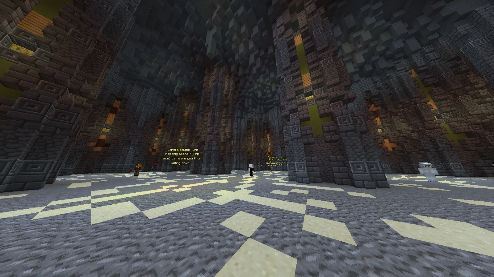 Double jumps can be activated by either double tapping the jump key (default: space) or right-clicking the feather given in the player's hotbar. Double jumps fling the player in the direction they are looking, helping them to jump large gaps, save themselves from falling, or even move up to a higher floor. Each player gets 11 double jumps.